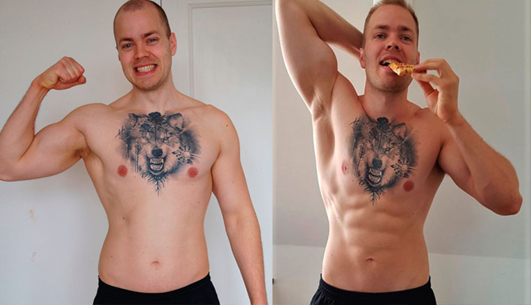 Lytter du til moderne kostbevægelser og madreligioner, så vil du ellers få at vide at pizza er fedende, og ikke kan indgå i en sund kost. For eksempel mener paleo-bevægelsen at du ikke må spise gluten og mælkeprodukter (= hvidt brød og ost), low carb-bevægelsen siger du ikke må spise stivelse (der er masser af carbs i en pizza), low fat-tilhængere mener mættet fedt er djævelen (der er mættet fedt i ost og kød), og clean eaters tillader ikke pizza, fordi det er forarbejdet mad, og dermed ”junk”. Alle disse bevægelser er dog baseret på forfejlede opfattelser af hvad der er sundt – i hvert fald hvis vi ser på den ernæringsvidenskabelige evidens – og flytter fokus fra det der i virkeligheden er vigtigt. Nemlig at få dækket sit behov for næringsstoffer (og det kan man gennem mange forskellige typer kost og fødevarer), uden at indtage flere kalorier end vi forbruger. Det har jeg allerede forklaret i detaljer i min artikel om myten om ”clean eating”: Men nogle gange taler handlinger højere end ord, og derfor besluttede jeg mig for at sætte handling bag ordene. Det blev starten på mit projekt ”Pizzakuren”. Jeg har spist en pizza om dagen i 6 ugerFor jeg mener der er brug for handling, og mere opmærksom omkring hvor megen misinformation der findes på sundhedsområdet, der flyder over med madmyter, mirakelkure, og magiske detoxes. De nyeste tal fra Sundhedsstyrelsen viser at mere end hver anden dansker nu er overvægtig, og det er min klare fornemmelse at fake news på sundhedsområdet bærer et medansvar for denne udvikling. Det ser jeg blandt andet i mit arbejde med overvægtige klienter, hvor jeg møder folk der tror at frugter er fedende, light sodavand er giftigt, og at man skal spise masser af fedt for at tabe fedt. Kort sagt: Almindelige danskere bliver komplet forvirrede om hvordan de skal spise, for at holde vægten, fordi de præsenteres for så mange modstridende informationer omkring sundhed og vægttab. Og det er et problem. For i virkeligheden undgår du ganske simpelt (dermed ikke sagt at det er let!) overvægt ved ikke at spise for mange kalorier. Og du kan godt holde vægten, og samtidig spise de ting du kan lide. Ja, du kan ligefrem tabe dig. Og det var netop det jeg ville vise med Pizzakuren. At jeg kunne tabe fedt og komme i sommerform, uden at give afkald på min elskede pizza. Ja, jeg ville faktisk spise mere pizza end nogensinde før. Nærmere betegnet en hel pizza om dagen, i 6 uger. Som sagt, så gjort, og nu er projektet ved vejs ende. Hvad skete der?Nu har jeg som sagt spist en pizza om dagen i 6 uger, fordelt på frysepizzaer, restaurantpizzaer, og et par hjemmelavede pizzabæster. Ja, faktisk er det blevet til lidt mere end én pizza om dagen, fordi jeg nogle dage kom til at spise en ekstra... Og på mirakuløs vis er jeg stadig ikke blevet træt af pizza! Undervejs har man kunne følge projektet på min Instagram, og jeg har lavet ugentlige updates om udviklingen på min egen side (dem kan du læse her). Men hvordan er det så endt? Er jeg blevet diabetisk, blind og tromletyk på grund af gluten-trolden, insulin-feen og carb-forbandelsen? Det synes jeg ikke. Nedenfor kan du se mine før- og efterbilleder, over de 6 ugers udvikling.