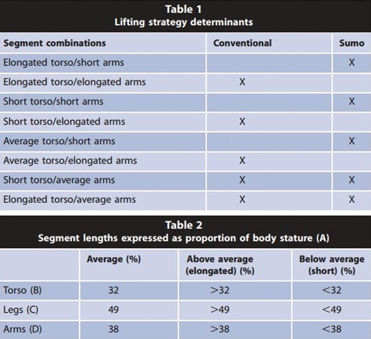 ![]() De 2 mest klassiske varianter, er de to øverste i skemaet: konventionel dødløft og sumo dødløft. I denne artikel vil jeg give dig en, måske ikke nem, men i hvert fald brugbar, metode til, at finde ud af hvilken af disse 2 varianter du skal vælge. Desuden vil vi kort se på dødløft med en hex-bar. Dødløft aktiverer, som udgangspunkt, muskulatur i både ben, ryg, hofter, arme og skuldre. De fleste betragter det som en ben/lower back øvelse, da det primært er disse muskler der udfører dynamisk arbejde, men den statiske aktivering er også høj i coremuskulaturen, skuldrene, armene og den øvre ryg, som skal på hårdt arbejde for at stabilisere kroppen og gribe om stangen. Et eksempel på en høj statisk aktivering er f.eks. den store rygmuskel, latissimus dorsi, som bliver aktiveret med op til 70 % af dens max kapacitet under et tungt dødløft, på trods af, at den stort set kun udfører rent statisk arbejde. Alt efter hvilken variant af dødløft man vælger, og hvordan øvelsen udføres, vil man belaste led, muskler osv. i varierende grad. Der findes et utal af dødløft variationer, som hver især har sine fordele og ulemper og aktiverer forskellig muskulatur i kroppenForskelle på sumo og traditionel dødløftErector spinae muskulaturen aktiveres ca. dobbelt så meget i konventionel dødløft ift. en sumo dødløft, da man kan holde ryggen mere ret i sumoudgaven. Denne mere oprejste torso betyder også, at man i sumo dødløft, nedsætter belastningen på de ofte problematiske L4/L5 og L5/S1 hvirvelovergange i lænden, hvor 85 % til 95 % af alle diskusprolapser forekommer. Har man rygproblemer, eller er man i sidste fase af en ryg-genoptræning, kan sumo dødløft altså være en anvendelig øvelse. I konventionel dødløft skal stangen bevæge sig en længere distance end i sumo, og den mængde arbejde der udføres og den mængde energi der bruges på løftet er derfor 25-40 % større. I sumo dødløft ser man større aktivering af vastus medialis, vastus lateralis og tibialis anterior, mens den mediale (midterste) del af lægmuskulaturen, gastrocnemius, er mere aktiv under et konventionelt dødløft. Konventionel eller sumo – hvad skal JEG vælge?Der er et ordsprog inden for styrkeløft som siger at gode dødløftere ikke bliver skabt, men gode dødløftere bliver født. Hermed mener man, at en stor del af det at blive god til dødløft hænger sammen med, hvordan du er bygget fra naturens side. Om dine kropsproportioner er gode ift., at få nogle fordelagtige biomekaniske forhold under løftet. Dermed ikke sagt, at man ikke kan komme til at løfte tungt, hvis man ikke er så heldig at have de helt rigtige mål, overhovedet ikke. Der findes eliteløftere der har helt håbløse mål, men der er ingen tvivl om, at det er en fordel at være bygget på en bestemt måde, hvis man vil være en god dødløfter. En måde at optimere sit løft på, er ved at vælge den mest favorable dødløft variation ift. ens kropsproportioner. Når du skal finde ud af om du er bygget bedst til sumo eller konventionel dødløft, kan du bruge tabellerne herunder. Det du skal have fundet ud af er, hvilke proportioner din krop har. ![]() ![]() Du starter med at måle din højde, altså hele kroppens højde. Denne kender de fleste, så du behøver måske endda ikke at måle. Dette mål kalder vi for (A). Derefter måler du hvor lange dine ben er. Dette gøres ved at måle fra trochanter major, ned til bunden af din fod. Dette mål kalder vi (C) ![]() Trochanter majors placering