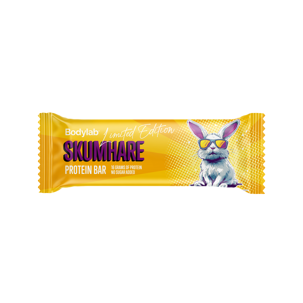 Mød Skumhare Protein Bar – en limited edition proteinbar inspireret af påskeharer og påskeslik. Det er vores udgave af et påskeæg. Bare i en version, der rent faktisk gør noget for dine gains. Den indeholder 16 gram kvalitetsprotein og 0 gram tilsat sukker, så du kan roligt smide en ekstra bar i træningstasken.