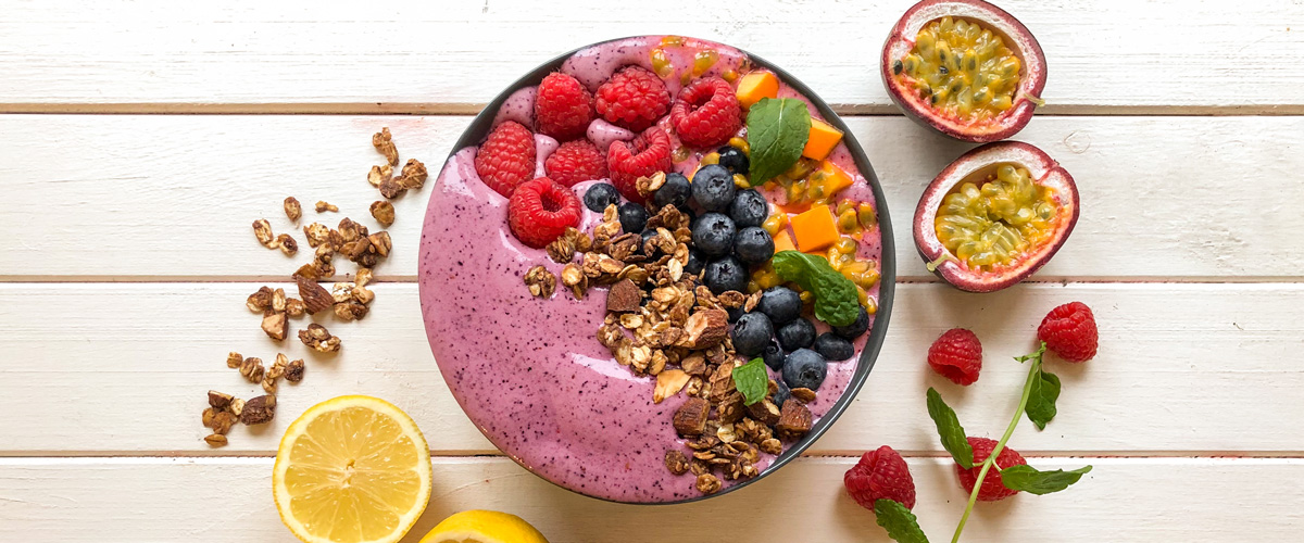 Purple smoothie bowl (1 portion)Smoothie bowls er altid et hit, og denne farvestrålende bærvariant skuffer bestemt ikke. Bare smid alle ingredienserne i blenderen, og giv det en ordentlig omgang! Så er der lækker, cremet morgenmad på ingen tid – nemt, ikke?